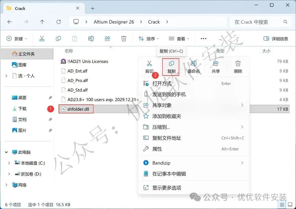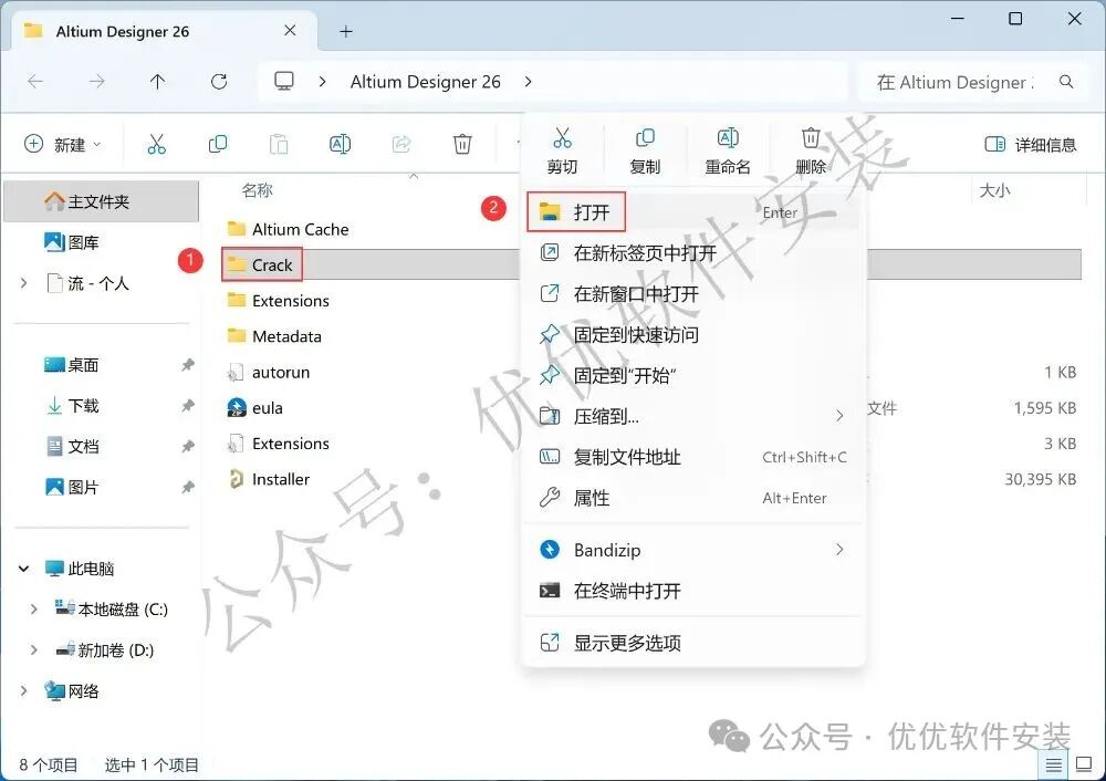 12、回到Altium Designer 26文件夹,找到【Crack】文件夹,右键【打开】它