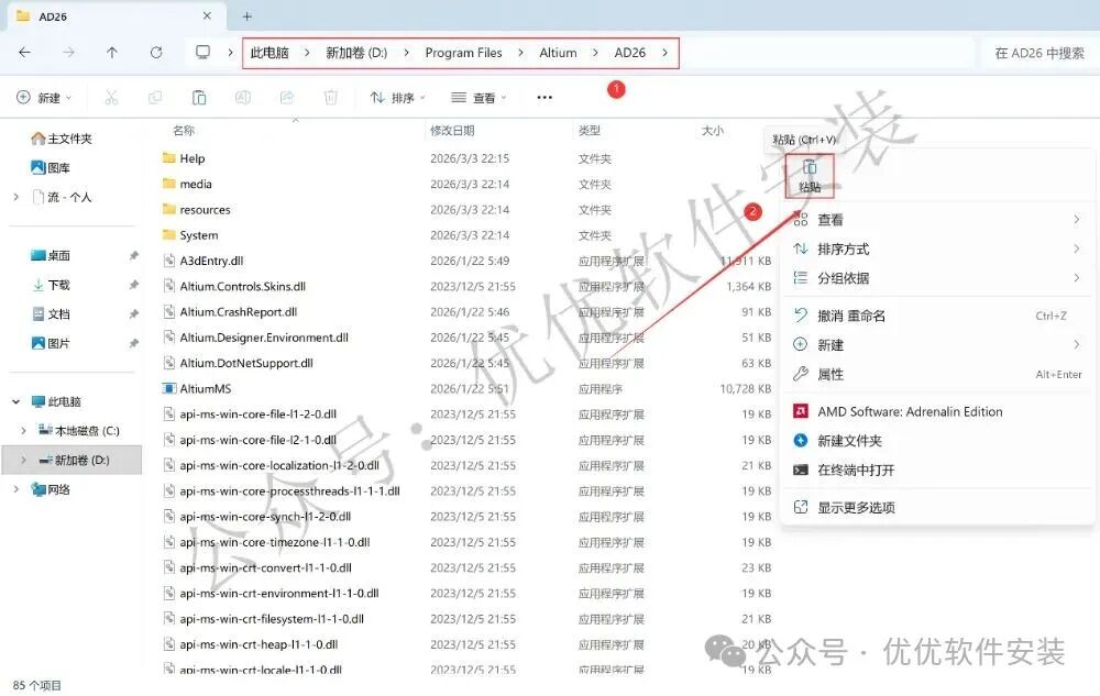 14、打开路径:D:\Program Files\Altium\AD26,再右键文件夹的空白处,点击【粘贴按钮】