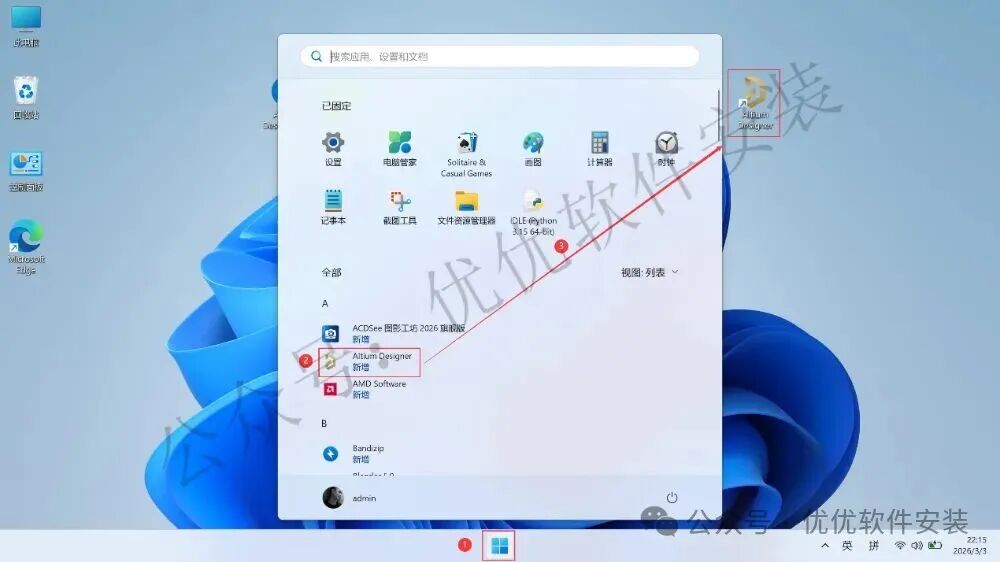 15、回到桌面,点击任务栏的【开始菜单】,在【所有应用】中找到【Altium Designer软件图标】,将软件图标拖到桌面上,完成软件桌面快捷方式的创建