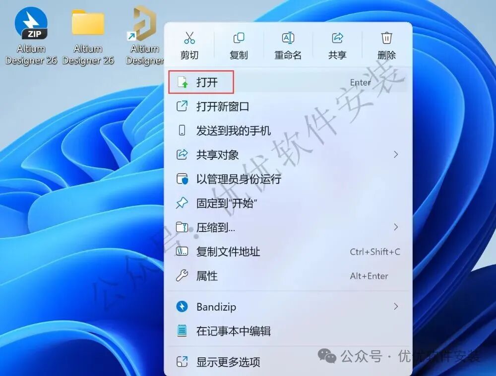 16、回到桌面,右键桌面上的【Altium Designer软件图标】,点击【打开】