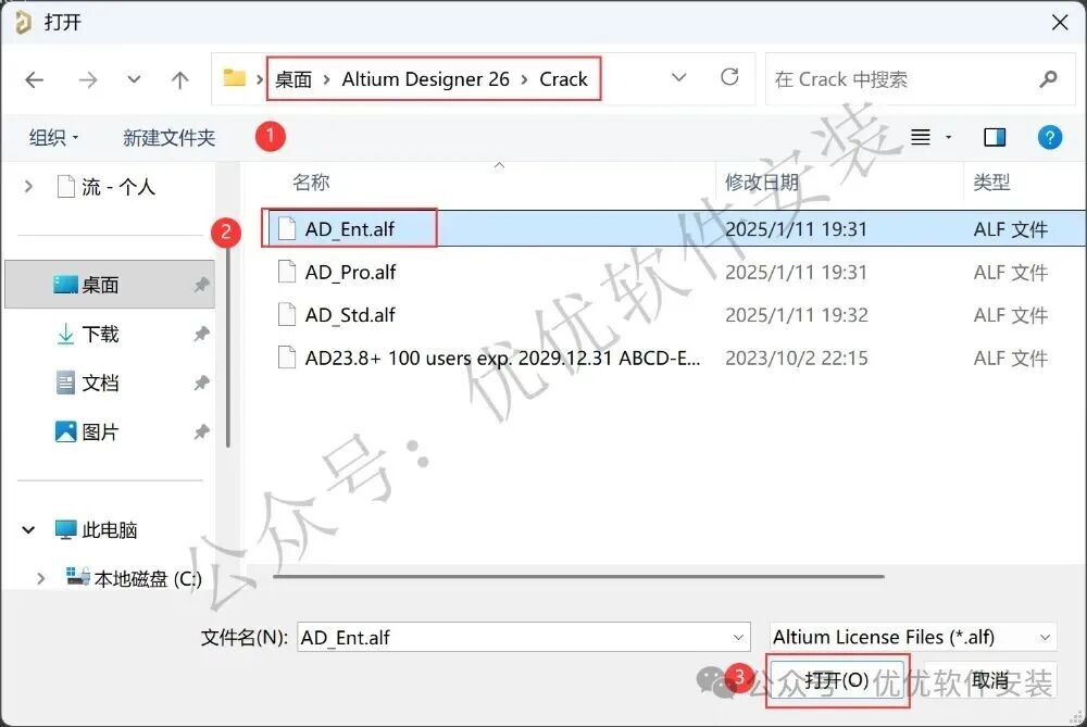 19、选中Crack文件夹的Lincense文件夹下的【AD_Ent.alf】文件,再点击【打开】