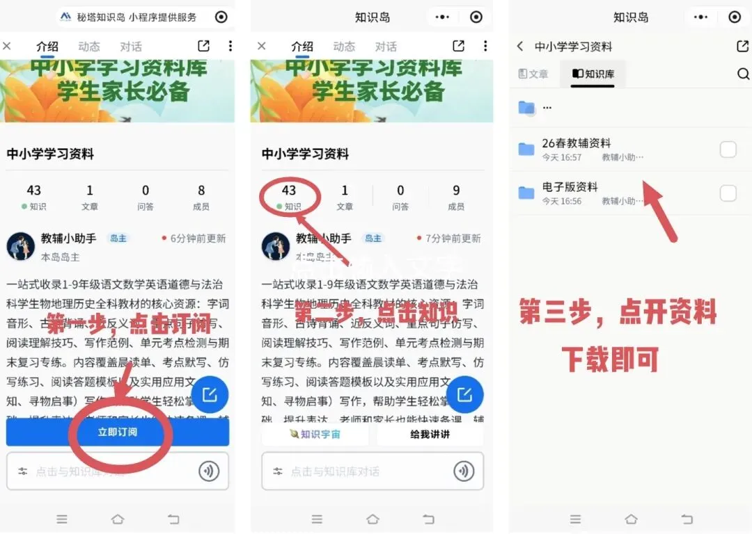 从今天起,1-9年级学习资料都会统一更新在「【秘塔知识岛】-【中小学资料库】里,并且全部免费分享,不收取任何额外费用!