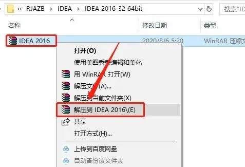 1.打开下载的软件安装包,鼠标右击【IDEA 2016】压缩包,选择【解压到IDEA 2016】。