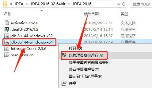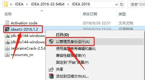 1.返回到开头解压的【IDEA 2016】文件夹,选中【ideaIU-2016.1.2】安装程序,鼠标右击选择【以管理员身份运行】。