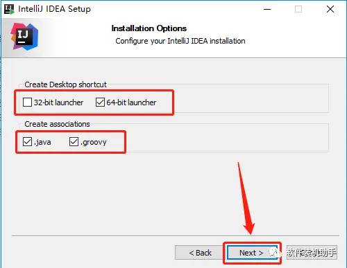 4.根据自己电脑的操作系统位数,32位的在【Create Desktop Shortcut】勾选32-bit launcher,64位的勾选64-bit launcher,教程中以64位操作系统为例,然后勾选【Create associations】中的两个选项,点击【Next】。