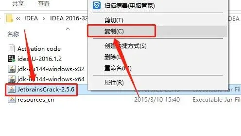 8.返回到开头解压的【IDEA 2016】文件夹,选中【JetbrainsCrack-2.5.6】文件,鼠标右击选择【复制】。
