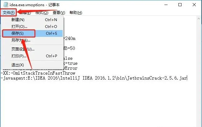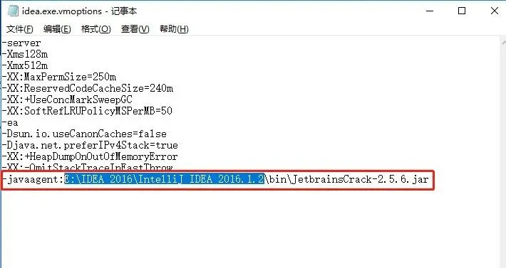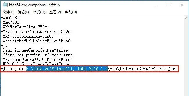 13.在文本的最后面加上【-javaagent:E:\IDEA 2016\IntelliJ IDEA 2016.1.2\bin\JetbrainsCrack-2.5.6.jar】其中【E:\IDEA 2016\IntelliJ IDEA 2016.1.2】是软件的安装目录。