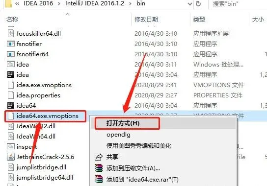 16.继续在该目录下面找到【idea64.exe.vmoptions】文件,鼠标右击选择【打开方式】。