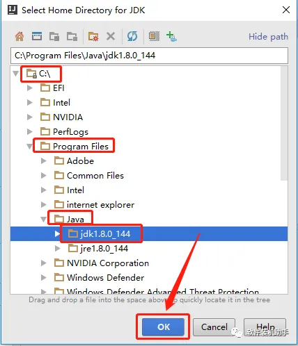 31.打开【C:\】目录,然后打开【Program Files】目录,继续打开【Java】目录,然后选择【jdk1.8.0_144】目录,选择好后点击【OK】。