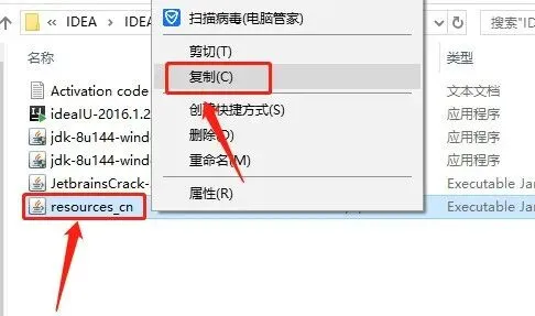 37.继续返回到开头解压的【IDEA 2016】文件夹,鼠标右击【resources_cn】文件选择【复制】。