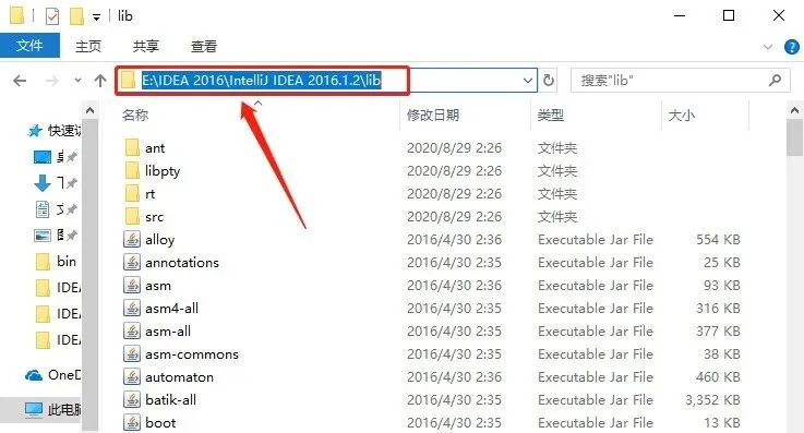 38.这里需要打开IDEA软件安装目录中的【lib】文件夹,打开路径为:【E:\IDEA 2016\IntelliJ IDEA 2016.1.2\lib】,打开【IDEA 2016】文件夹。
