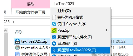1.将下载好的文件夹双击打开后找到【texlive2025.zip】压缩包,鼠标右键选择【解压到LaTex.2025\】。