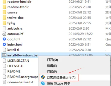 2.打开刚刚解压后的文件夹,找到【install-tl-windows.bat】,鼠标右键选择【以管理员身份运行】。