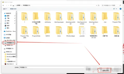 5,选择你要修改的盘符,然后点击【选择文件夹】(如我修改安装在D盘)。