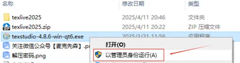 10,回到下载的那个文件夹,找到应用程序【texstudio-4.8.6-win-qt6.exe】,鼠标右键,选择【以管理员身份运行】。