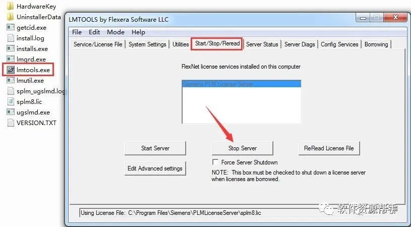 20.打开PLMLicenseServer目录中lmtools,点击图示中的Stop Server