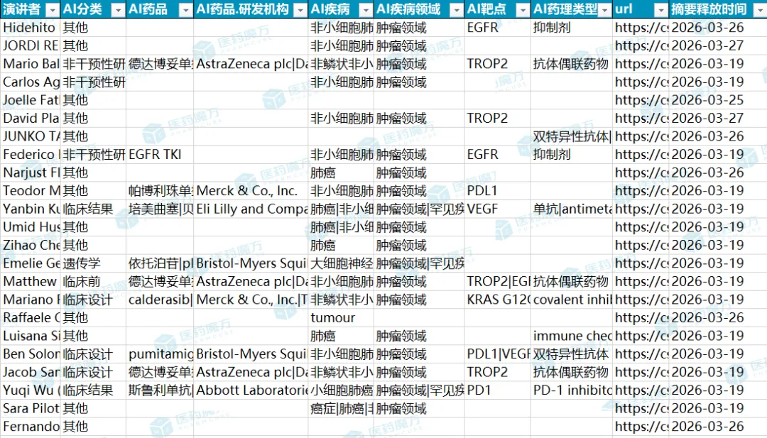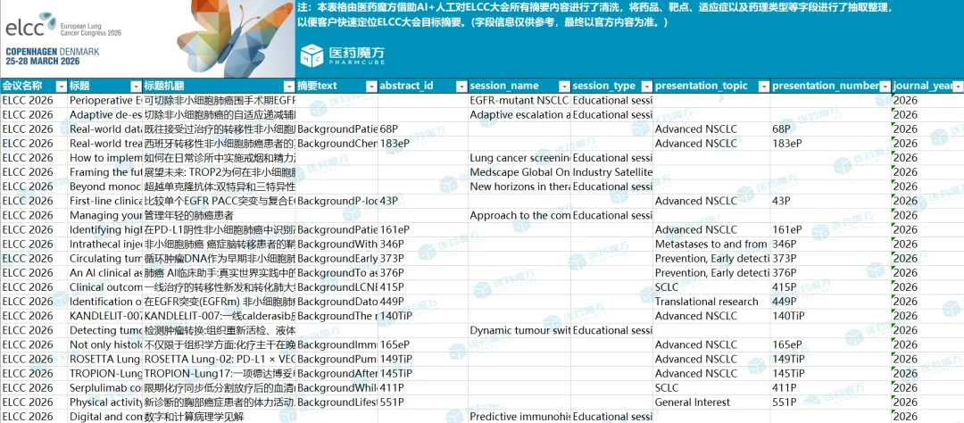 近日,ELCC官方公布了本次大会摘要内容。医药魔方对本届大会超600条摘要内容数据进行了整合清洗,借助AI抽取了每条摘要涉及的药品、靶点、机构、适应症以及药理类型等关键字段,汇总形成了ELCC摘要数据合集(提供中英双语版本)。