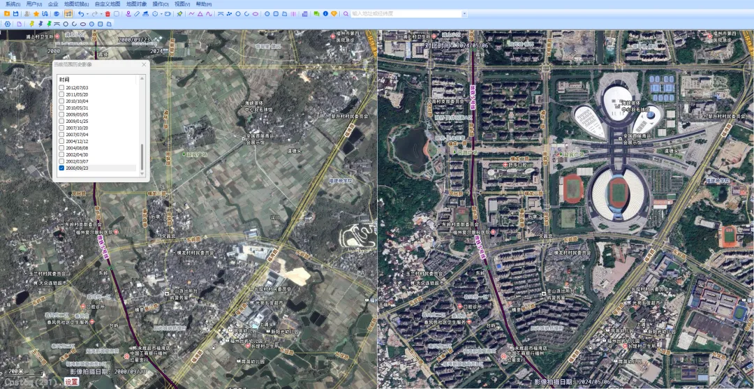奥维地图可以加载古歌历史影像图源数据,可以查询到1980年到现在的城市历史卫星图,其分辨率和数据可以说是最为全面的,你也可以使用谷歌地球客户端软件直接查看历史影像。