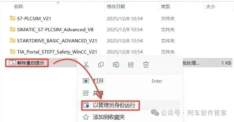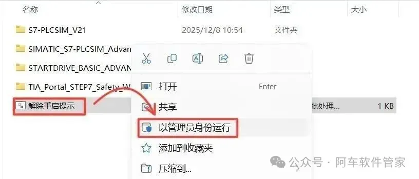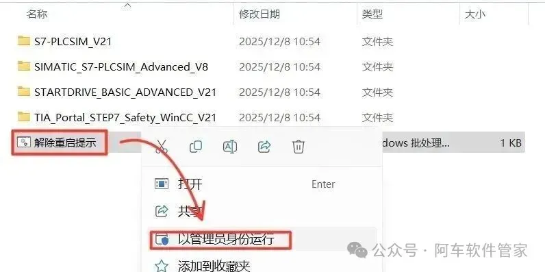 20.打开安装包解压后的【TIA portal V21(64bit)】文件夹中的【Setup】文件夹,鼠标右击【解除重启提示】,选择【以管理员身份运行】。