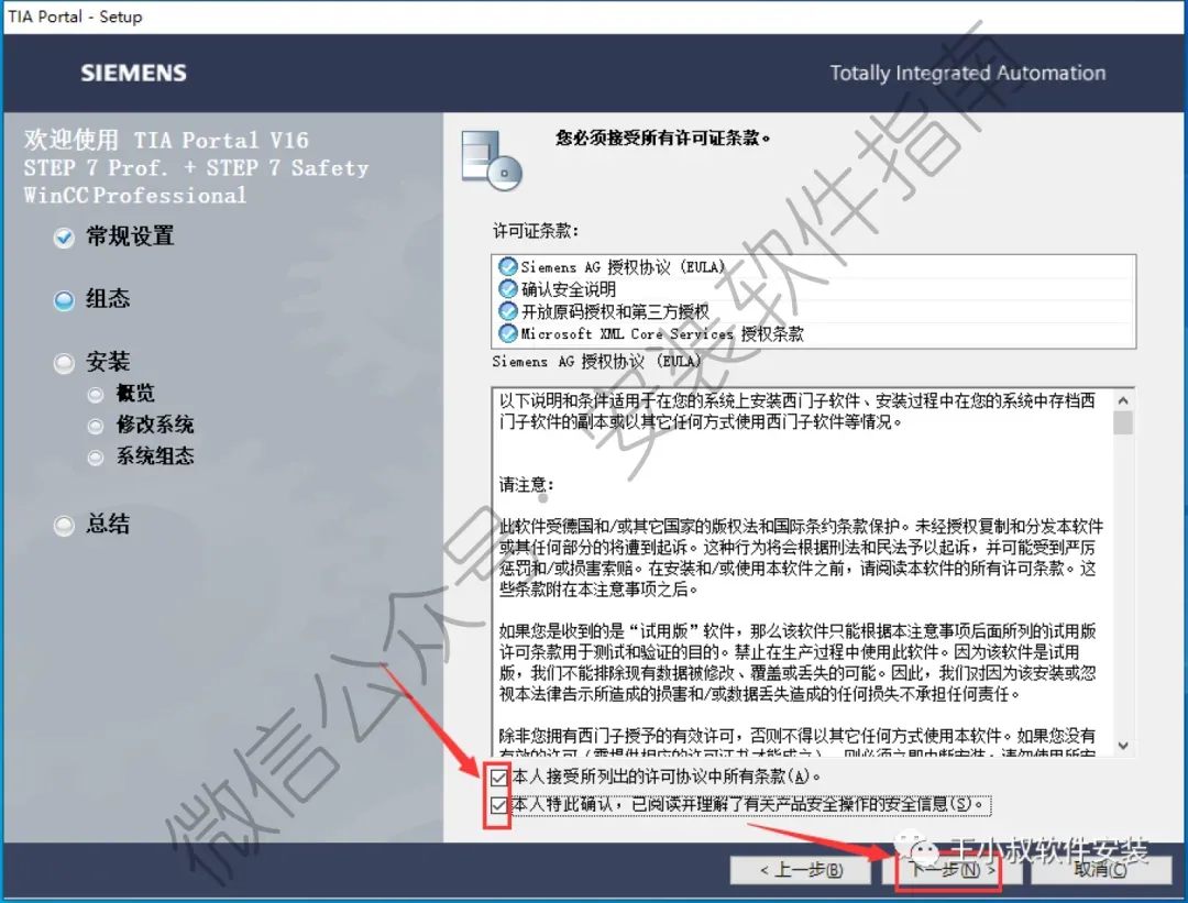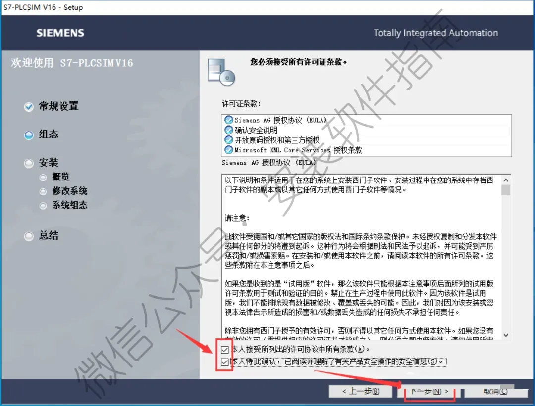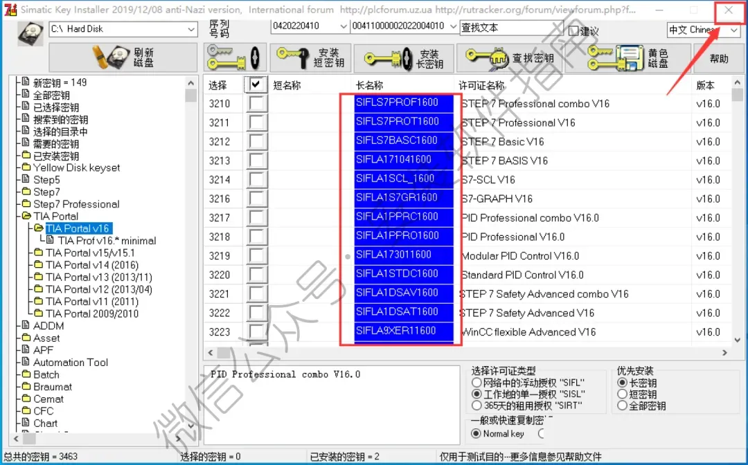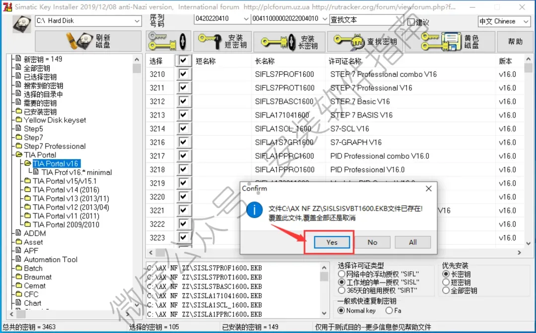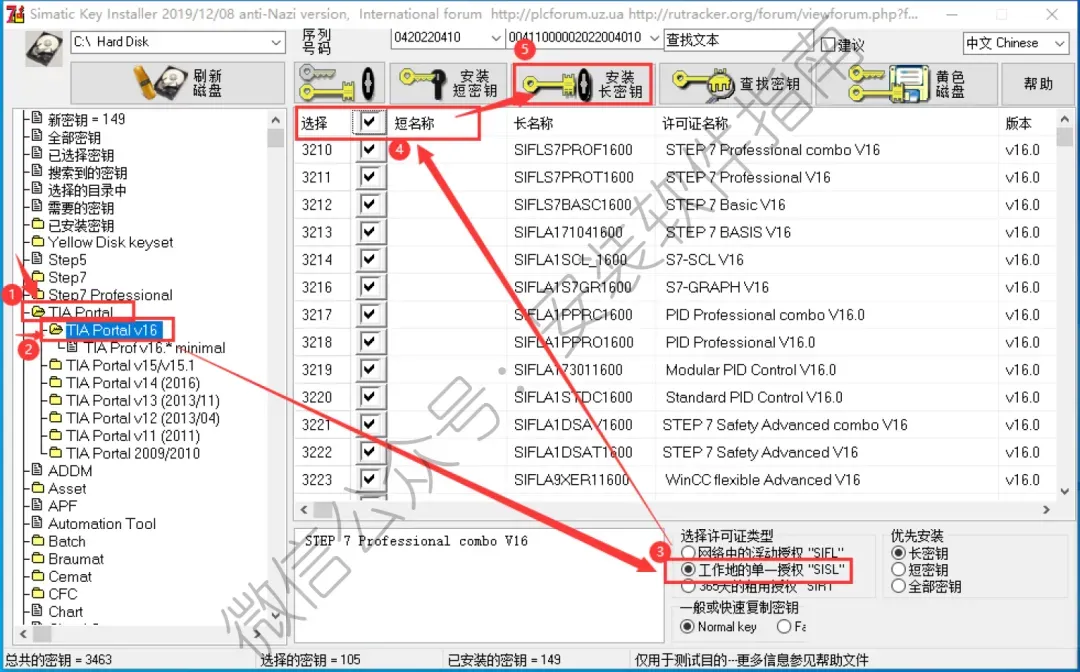 39、❶双击【TIA Portal】,❷双击【TIA Portal V16】,❸选择【工作地的单一授权】,❹勾选(图中所示标注,全选),❺点击【安装长密钥】。