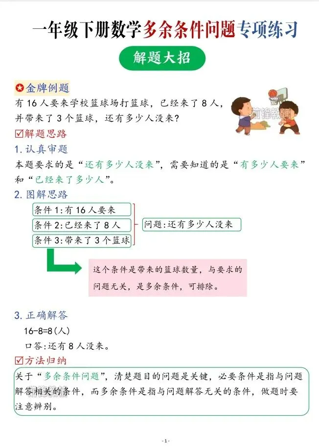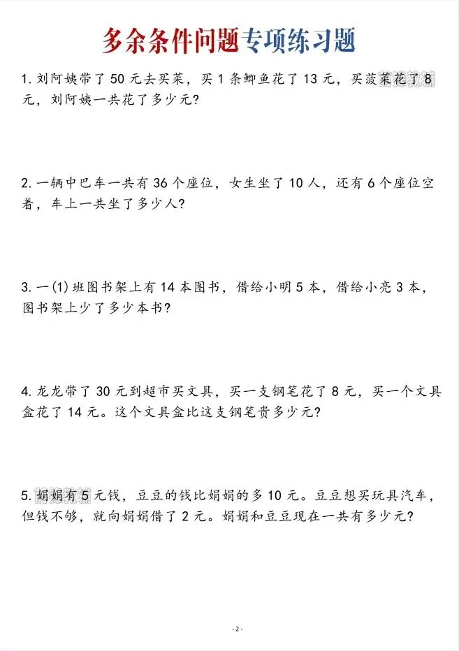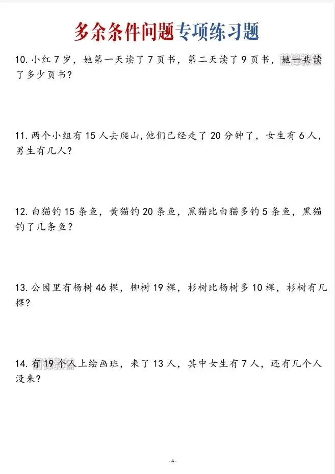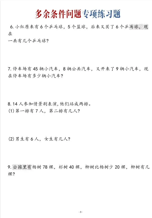今天给大家整理了一年级数学下册专项多余条件问题专项练习,转发给朋友或班级群,受益更多人,帮助孩子学习!
