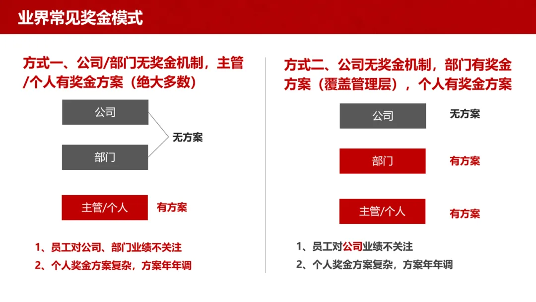 模式一:公司、部门无奖金机制,仅主管 / 个人有方案,导致员工对组织业绩漠不关心,个人方案复杂且年年调整,稳定性不足。