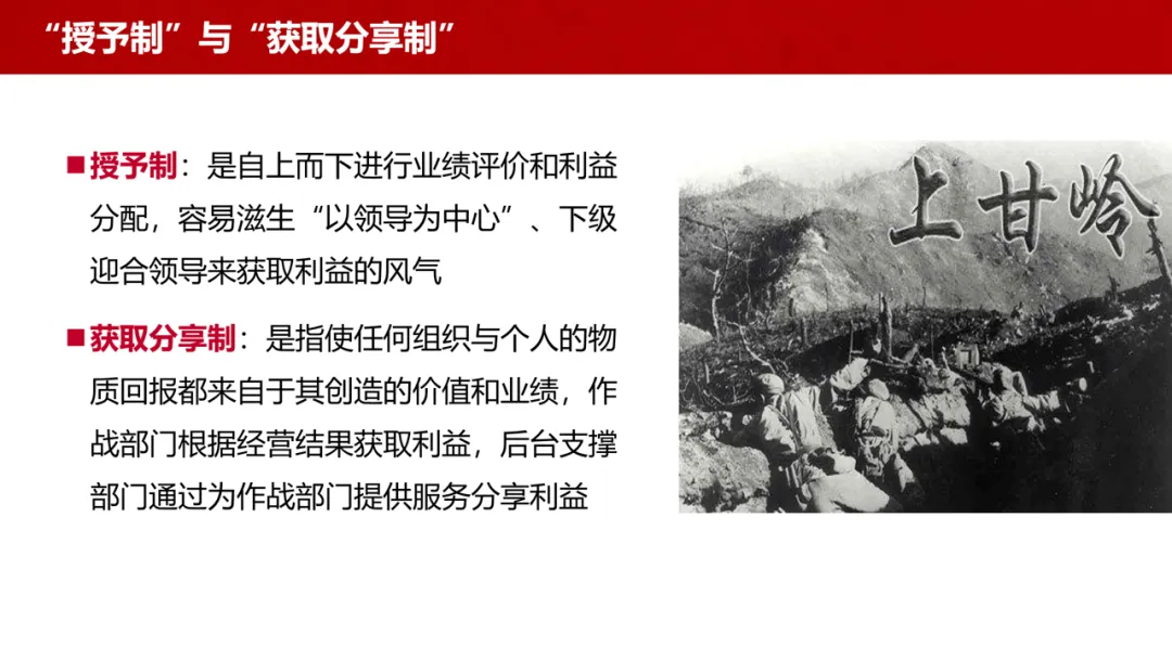 核心机制:摒弃传统 “授予制”,推行 “获取分享制”—— 任何组织与个人的物质回报均源于其创造的价值和业绩,作战部门按经营结果获取利益,后台支撑部门通过服务作战部门分享利益,杜绝 “以领导为中心” 的分配风气。