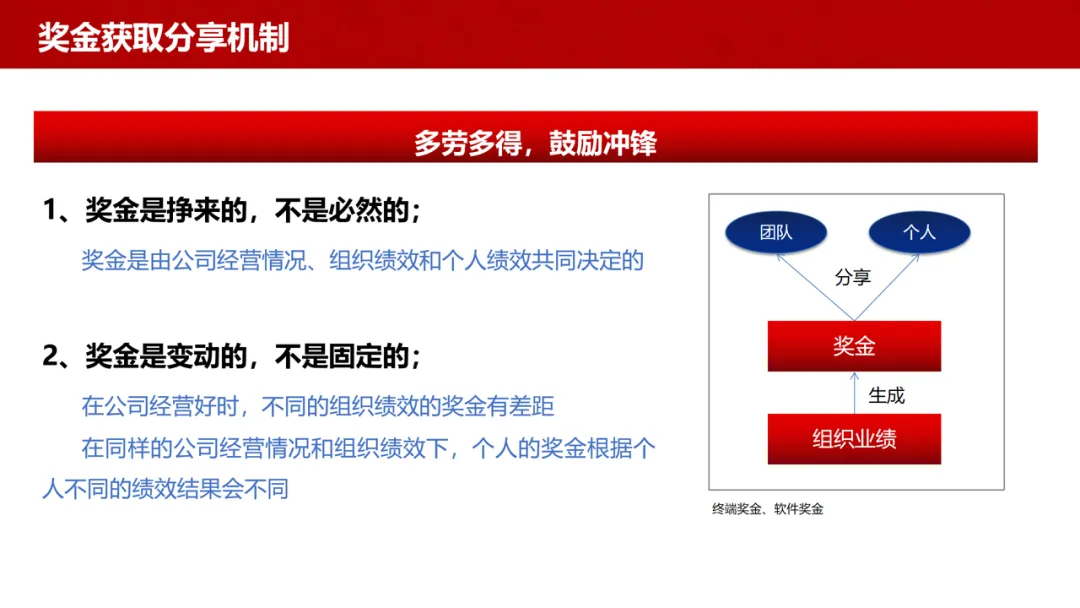 经营奖金(获取分享):与短期业绩挂钩,多劳多得,自上而下按经营结果分配,覆盖终端、软件等业务线。