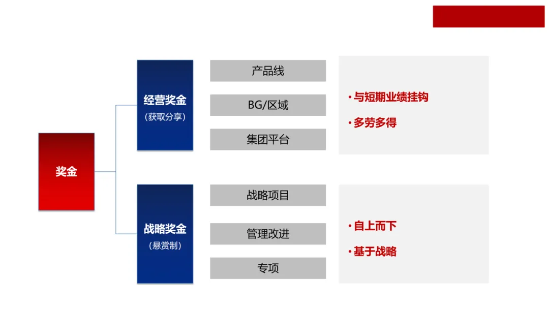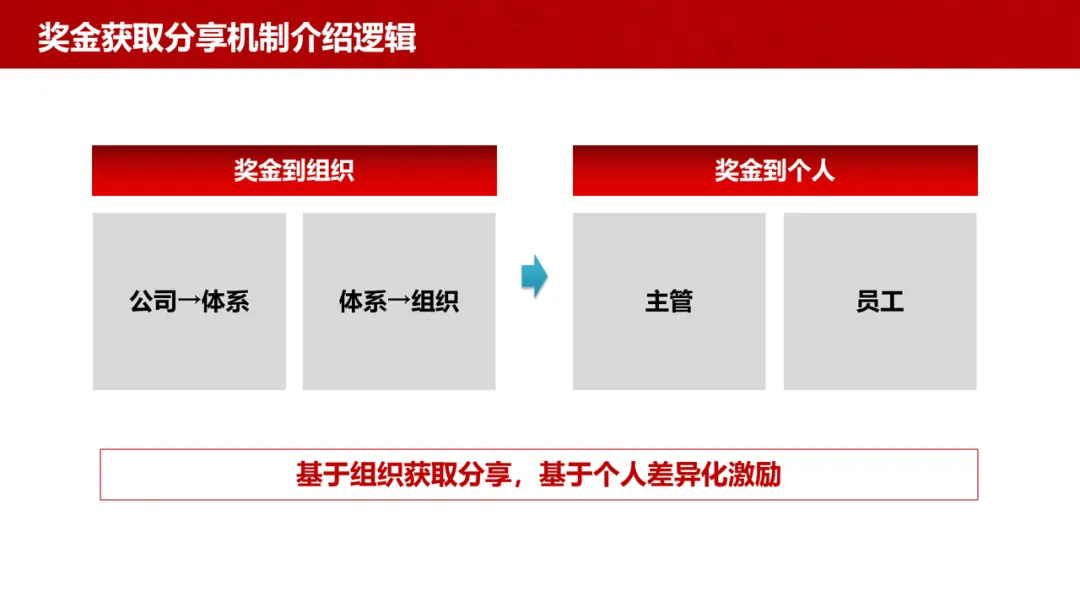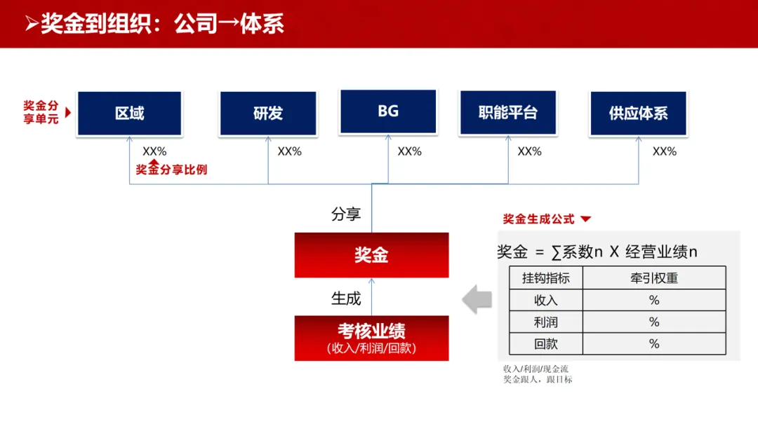 公司→体系:按区域、研发、供应体系等维度分配奖金包,核心依据经营业绩达成情况。