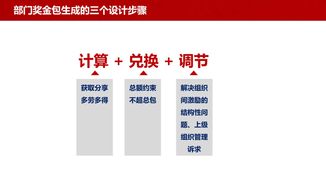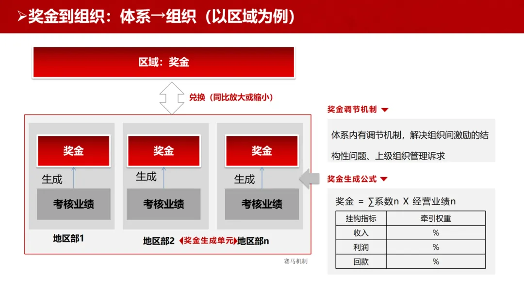体系→组织:以区域为例,通过 “计算 + 兑换 + 调节” 三步生成部门奖金包,计算环节依托线性公式,兑换环节实现业绩同比放大或缩小,调节环节解决组织间激励结构性问题,落实上级管理诉求。