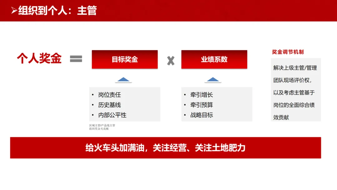 主管层面:以组织奖金为天花板,结合岗位责任、历史基线与内部公平性设定个人目标奖金,再通过业绩系数牵引增长与战略目标达成。