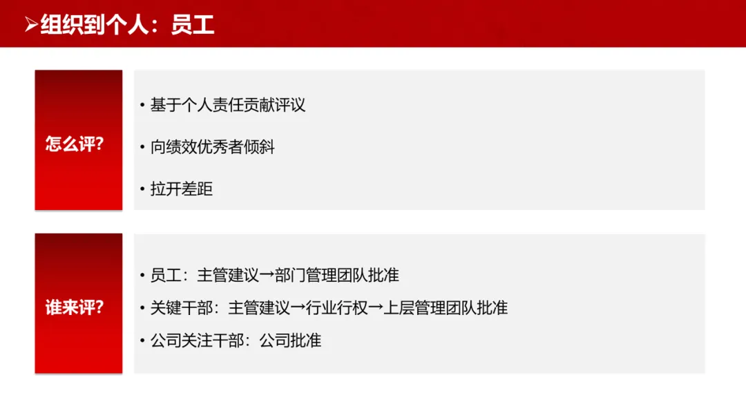 员工层面:基于个人责任贡献评议,向绩效优秀者倾斜,拉开差距;普通员工奖金由主管建议、部门管理团队批准,关键干部需经行业行权与上层管理团队批准,公司核心关注干部由公司直接批准。