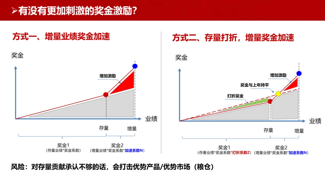 存量打折 + 增量加速:存量业绩按打折系数 Z 计算,增量业绩按加速系数 N 计算,平衡存量稳定与增量突破。