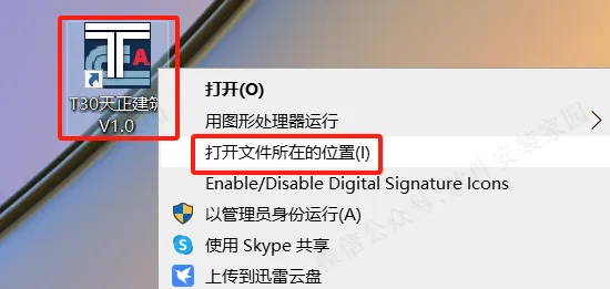 11.回到桌面,选中“T30天正建筑V1.0”鼠标右键,点击打开文件所在的位置