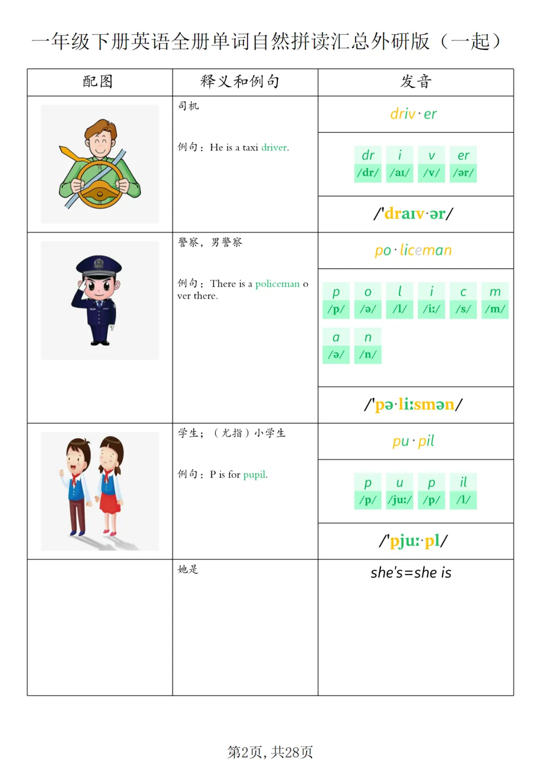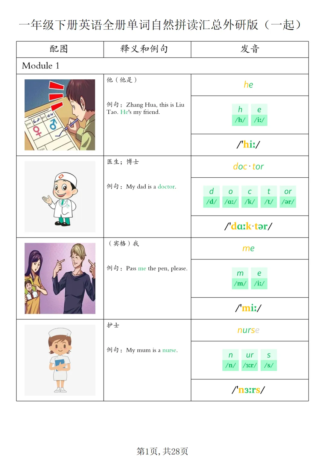 一年级(下)英语 全册单词自然拼读汇总《外研版(一起)》
