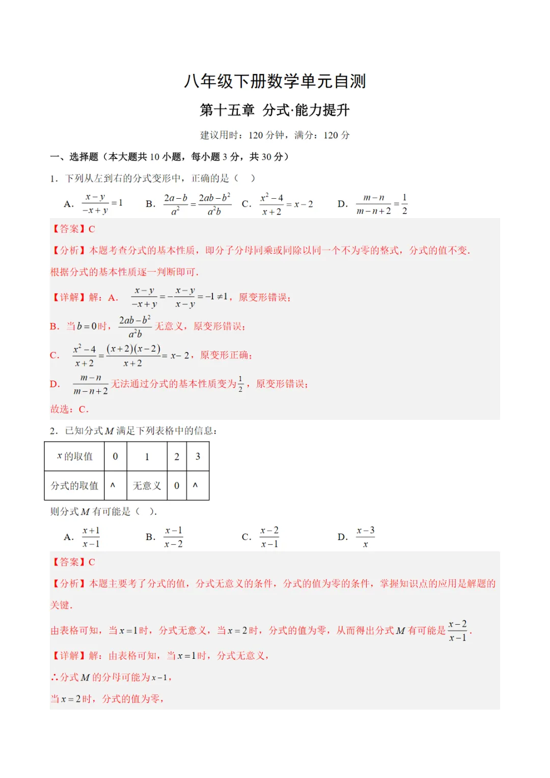 【免费下载】八下数学第十五章 分式·提升卷(解析版)华师,可打印