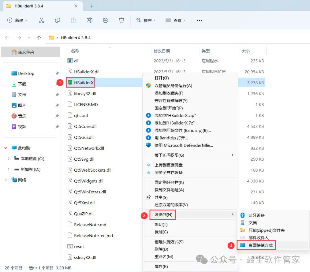 3、找到【HBuilderX】应用程序,右键依次点击【显示更多选项】、【发送到】、【桌面快捷方式创建】,完成HBuilderX 3.8.4软件桌面快捷方式的创建