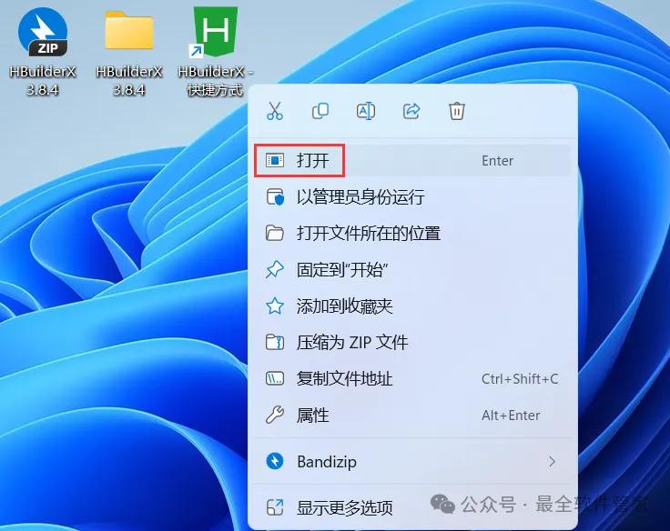 4、回到桌面,右键桌面上的【HBuilderX软件图标】,点击【打开】
