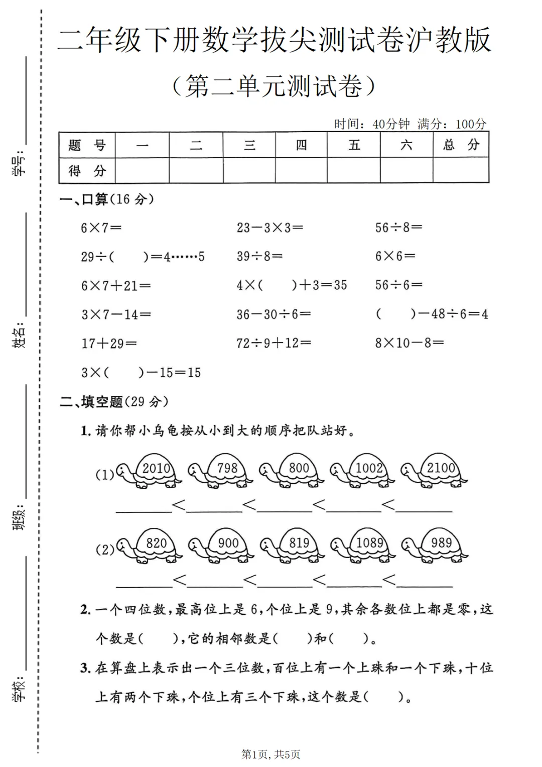 【免费下载】二年级(下)数学 第二单元拔尖测试卷1《沪教版》,PDF电子版,可打印