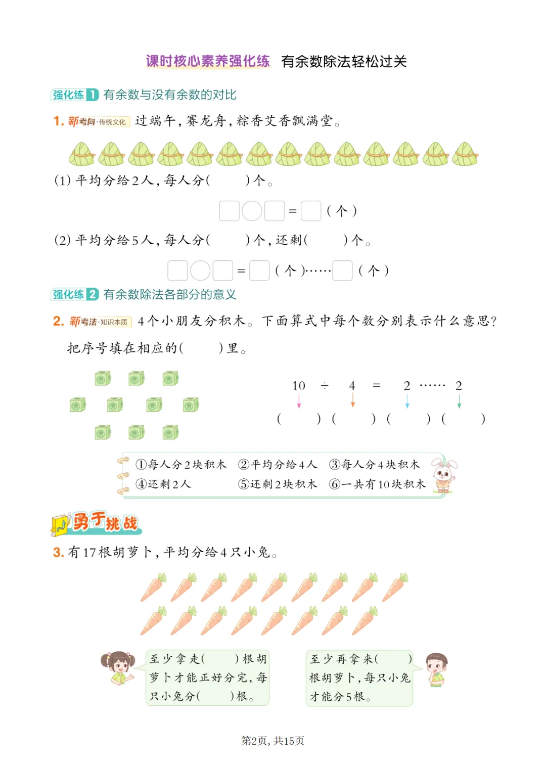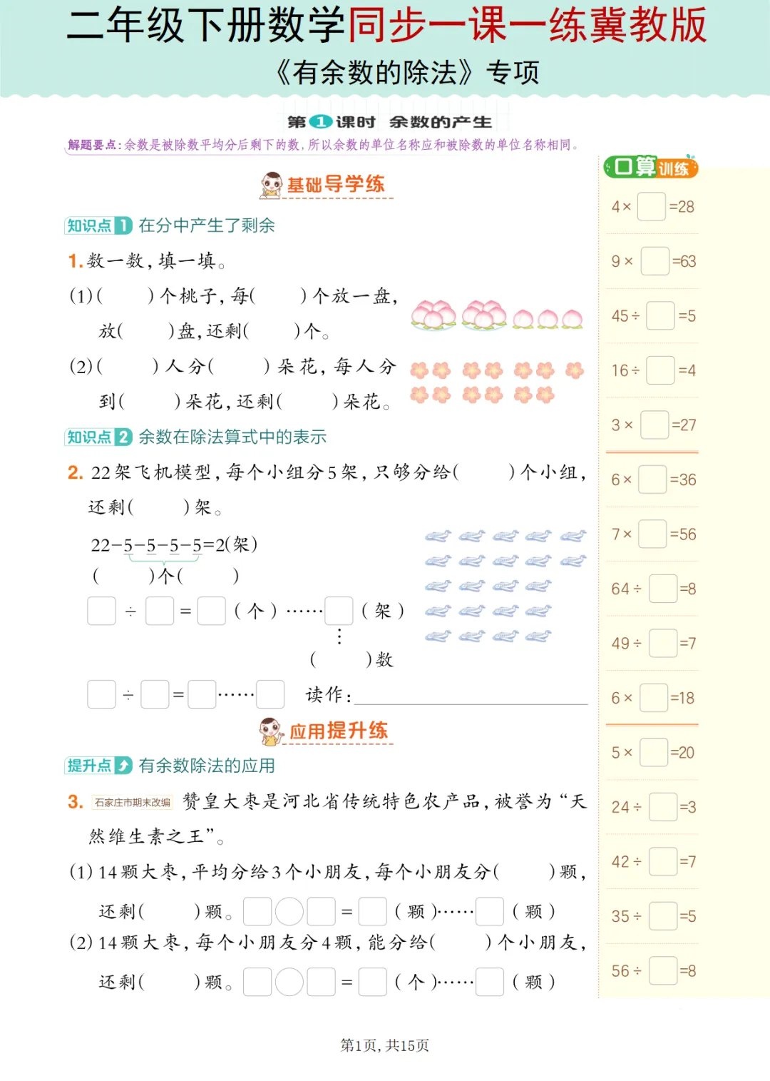 【免费下载】二年级(下)数学 《有余数的除法》同步一课一练《冀教版》,PDF电子版,可打印