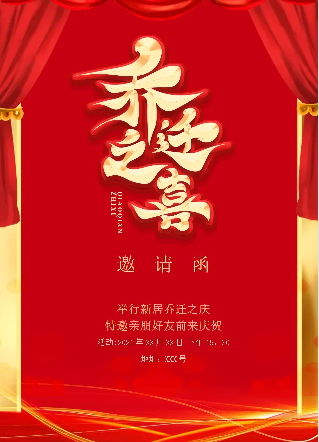 这 8 款乔迁电子邀请函模板,覆盖新居落成、店铺搬迁、公司乔迁等多种场景,风格简约大气、温馨喜庆,直接替换文字就能用,省时又省心。不用费心排版,不用纠结措辞,一键分享到微信、朋友圈,仪式感拉满,还能清晰告知时间、地点,避免邀约疏漏。