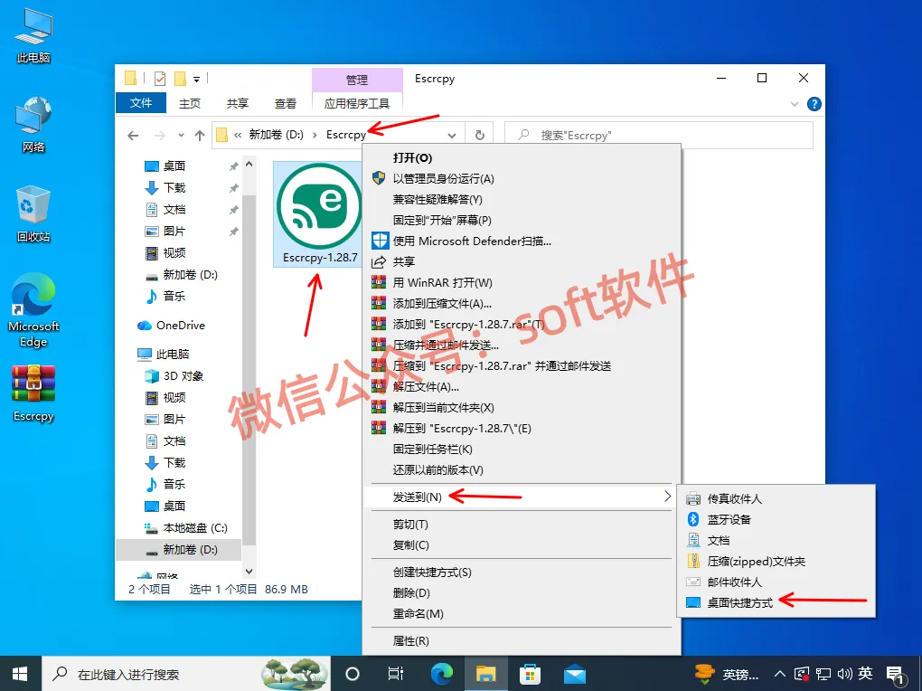 4,进入粘贴后的文件夹里面。鼠标右键Escrcpy-1.28.7,选择发送到桌面快捷方式