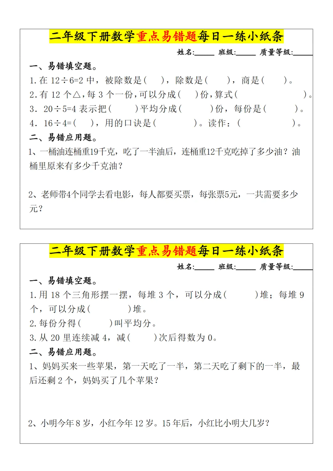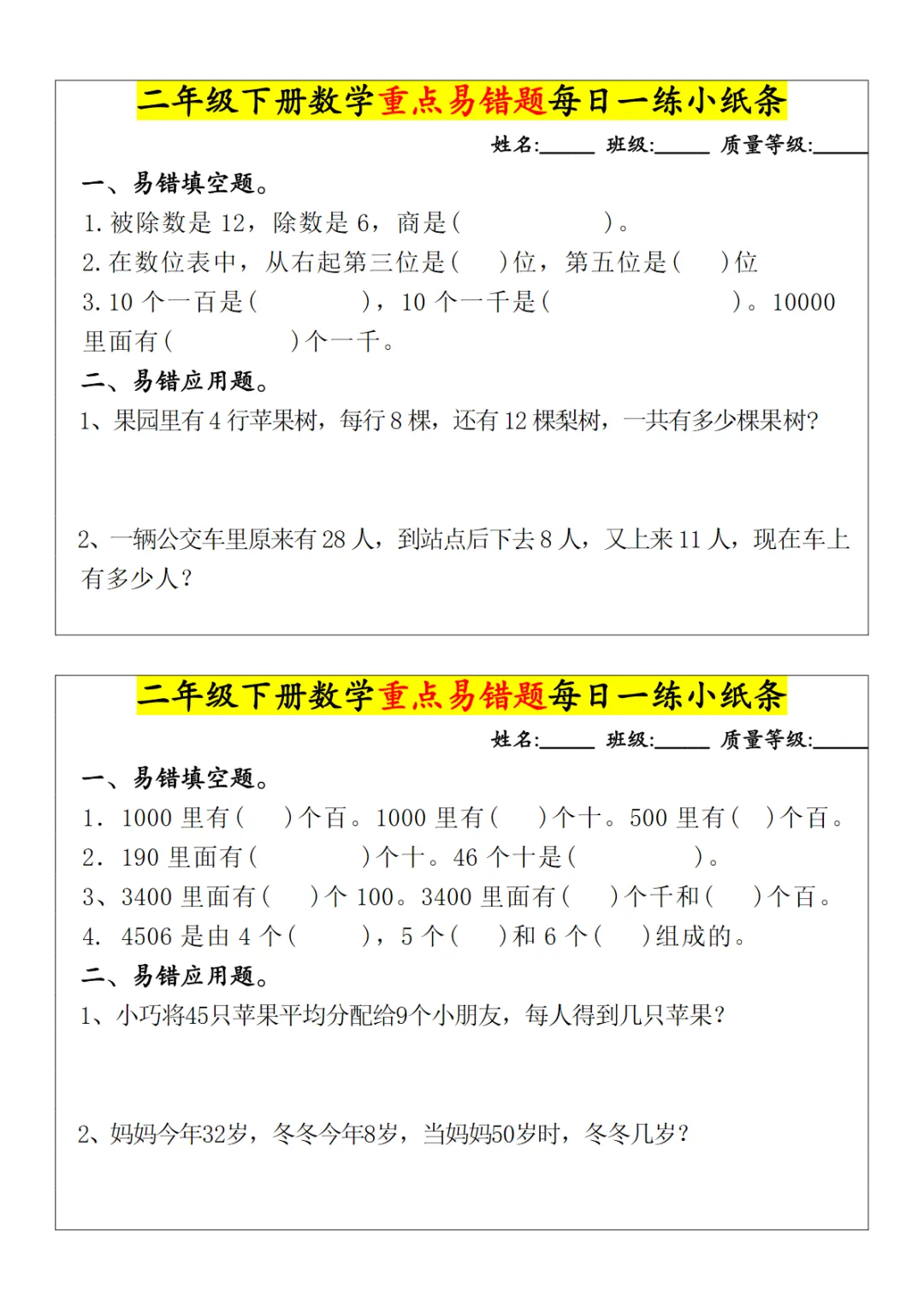 【免费下载】二年级(下)数学 重点易错题每日一练小纸条,PDF电子版,共5页,可打印