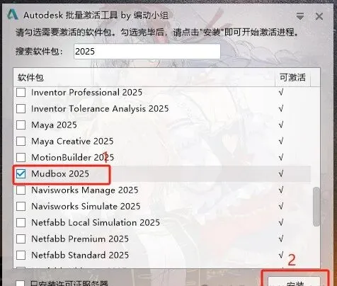 第十一步:勾选【Mudbox2025】,然后点【安装】。