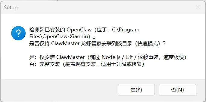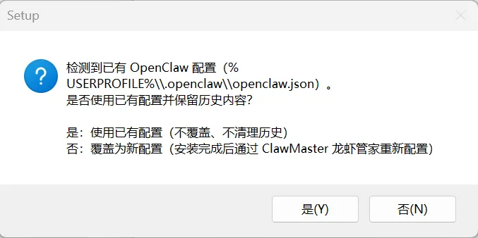 3.双击安装包,如果之前安装过,可能会出现下面的提示,根据自己的情况自行选择:(强烈建议提前备份本地用户目录下的.openclaw目录)