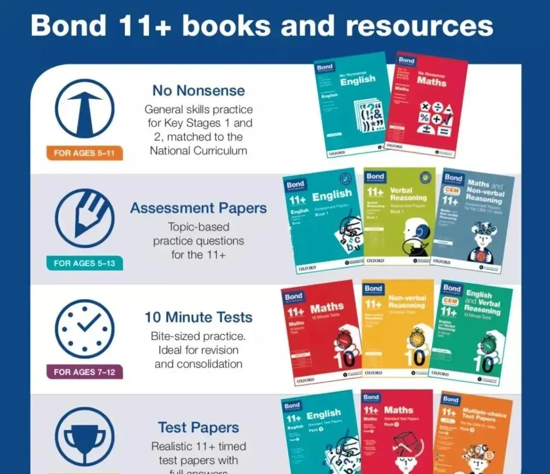 先普及一下11+吧!你会在每一本Bond系列封面上都会看到11+这个标识。11+其实代表着孩子在英国初中的入学年龄,即11到12岁。