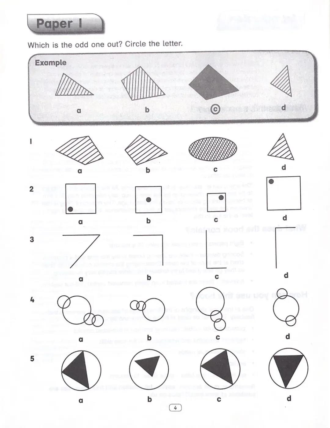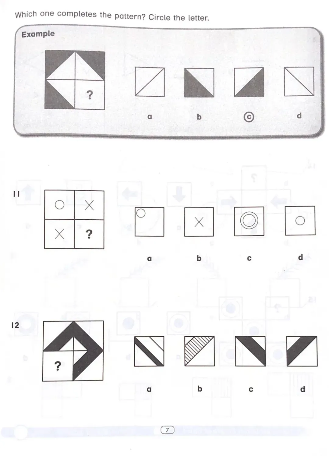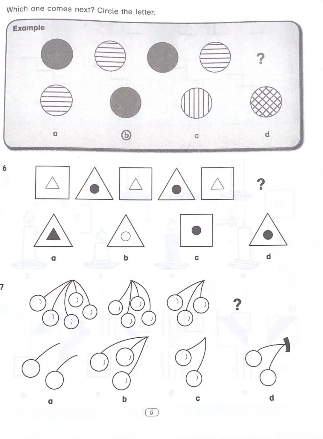 黄色封面的练习册专门训练图形推理,孩子们在一些图案中寻找规律,答出相应的题目。