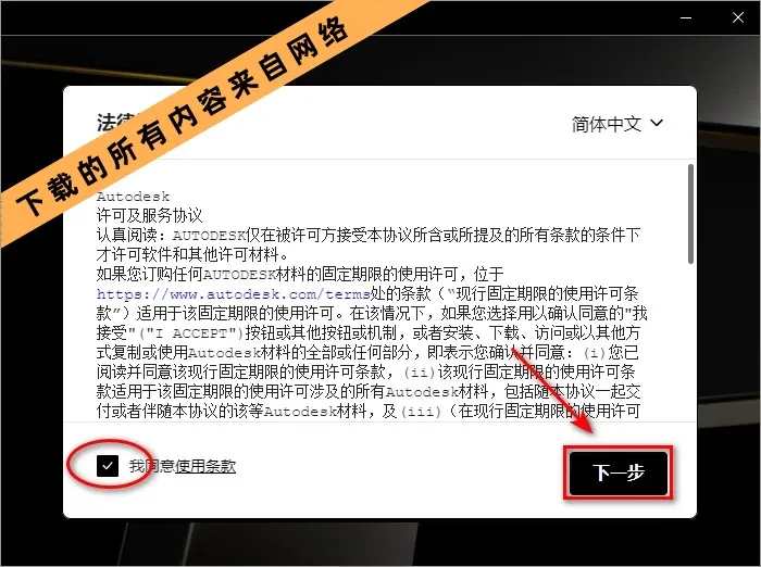 4.勾选我同意使用条款,点击“下一步”