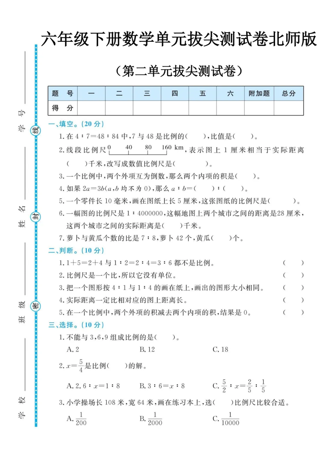 【免费下载】六年级(下)数学 第二单元拔尖测试卷《北师版》,PDF电子版,共5页,可打印