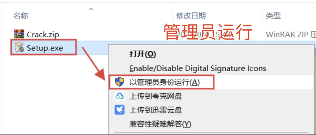 3、以管理员身份运行安装程序:选中:Setup,右键选择:以管理员身份运行。